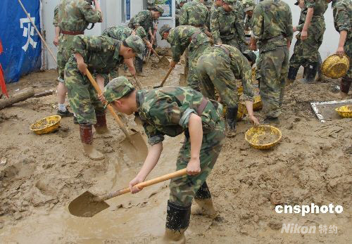 連日來,四川成都、綿陽、廣元等地連降暴雨,北川縣擂鼓鎮因地震而松軟的山體被雨水浸泡后大量塌方,產生的泥石流沖毀了不少村莊和居民安點置點。四川預備役高炮師200余名官兵問汛而動,冒著被飛石砸傷和被泥石流沖走的危險,翻山越嶺,徙步8小時趕赴災區,營救被困群眾,搶救物資,排污去淤。圖為10月7日,官兵們在一災民安置點排污去淤。中新社發 王玖成 攝