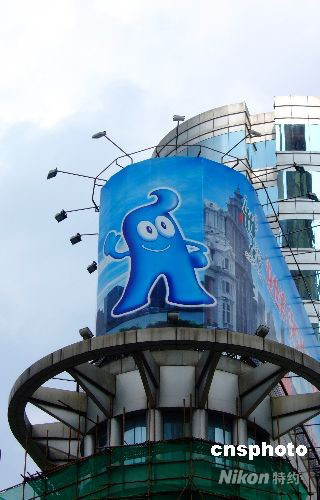 2008年10月9日,上海在迎世博600日活動中高潮迭起,“海寶”形象紛紛登上高樓。中新社發 蔣振雄 攝