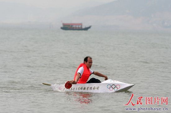 福建省廈門市廈大白城海面上,朱亞林坐在自己親手打造的紙船用乒乓球當(dāng)作雙槳開始試航。