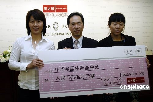 10月15日,著名珠寶品牌周大福在國家體育總局,舉行名為“銘記2008,共享璀璨榮耀”的慈善捐贈新聞發布會,宣布將周大福Forevermark永恒印記“榮耀之星”的部分拍賣款項50萬元人民幣,捐助予“中華全國體育基金會(中國運動員委員會)”,這也是該委員會成立以來的首筆社會愛心團體的公益捐贈,此筆善款將用于支持該委員會開展體育公益工作,以號召更多企業關注和支持中國體育事業發展。周大福董事陳世昌先生、國家體育總局體育基金管理中心副主任、中華全國體育基金會副理事長王彥敏先生與著名運動員周繼紅女士(國家體育總局游泳運動管理中心副主任、運動員委員會主任委員),錢紅女士(游壇“五朵金花”之一),高紅(“鏗鏘玫瑰”之一、老國家女足守門員)均蒞臨現場。此前拍賣的Forevermark永恒印記“榮耀之星”27.16克拉梨形美鉆,作為周大福專為2008年北京奧運會獻禮之作,脫胎于重達70克拉的南非原產鉆胚。更為珍貴之處在于在其臺面上印記有源自周大福鉆石原胚全球合作伙伴——世界最大的鉆石原胚供應商戴比爾斯集團的“Forever mark”永恒印記”,其中特別珍選并全球唯一的“20080808”序列號碼,特別銘記2008北京奧運,銘記中華體育世紀盛事。中新社發 楊可佳 攝