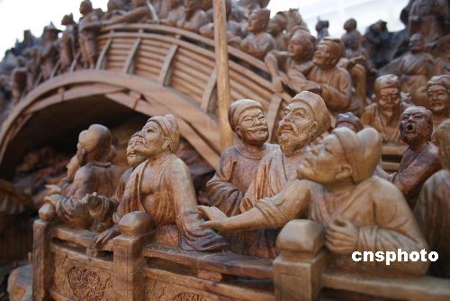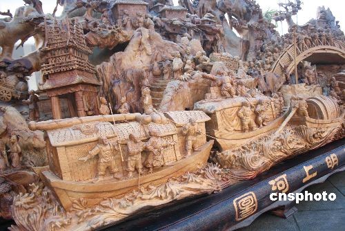 10月21日,長18米的巨型根雕《清明上河圖》在開封東京藝術中心廣場展出。據工作人員介紹,這一作品原木是一株生長在東南亞熱帶崇山峻嶺中的香樟古木,樹齡在2300年以上,樹高百米,樹干直徑4米,根徑20米,完全暴露風干近10年。后以北宋畫家張擇端的《清明上河圖》為藍本,由福建35位藝術家和工匠歷時5年精雕細刻而成。雕刻完成后,作品長18米,高2.56米,寬2米,重12噸。 據悉,這一來自福建莆田的巨型香樟木根雕《清明上河圖》作品,已經申報吉尼斯世界紀錄。中新社發 劉書亭 攝