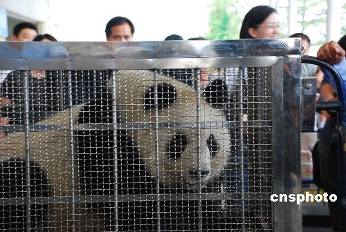 10月22日,兩只國寶級大熊貓“樂山”、“珍大”抵達(dá)杭州蕭山國際機(jī)場,立即乘車去它們的新家——浙江安吉竹博園落戶。據(jù)飼養(yǎng)員史斌遞介紹,這兩只大熊貓來自四川成都大熊貓繁育研究基地,均為雄性,每只重約100公斤,年齡都大約在兩歲半左右,相當(dāng)于人類的八九歲。它們都很好動,愛爬樹,是熊貓家族里的“運(yùn)動健將”。中新社發(fā) 夏毅 攝