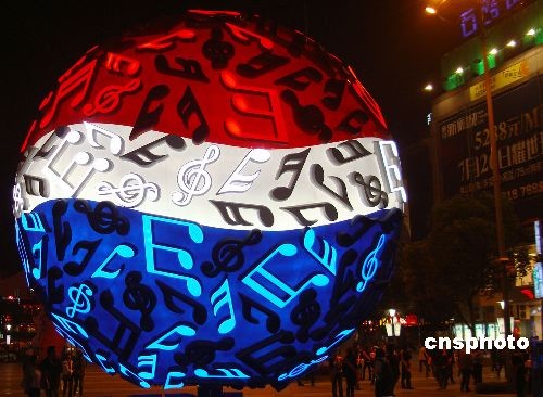 2008年10月24日晚,游客在欣賞蘇州石路步行街廣場上燈光變幻的巨型音符球。近日,蘇州石路步行街廣場上一只直徑達3米的巨型音符球亮燈。中新社發 王建康 攝
