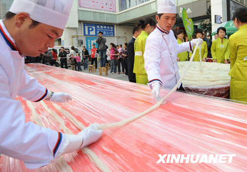 11月2日,一家方便米線生產廠家在鄭州街頭舉行挑戰最長的方便米線活動,商家展示出他們特意加工的一把113根米線,每根長420.4米。