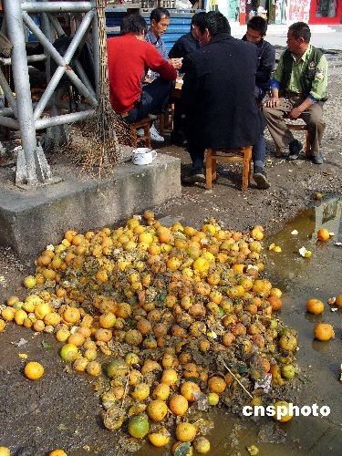 2008年11月3日,湖北宜昌市夷陵區土門鎮,橘農在向外地客商低價出售柑橘,路邊腐爛的柑橘隨處可見。據悉,受四川廣元“蛆柑”事件影響,沒有出現疫情的湖北省柑橘外銷曾一度全面停滯,經有關有關部門“救市”后,目前銷售正在回暖,但收購價僅在每斤0.10元—0.35元,比往年的收購價每斤0.25元—0.65元大幅下跌,橘農們經濟損失慘重。 湖北宜昌柑橘年產量約148萬噸,占湖北省總產量的60%。柑橘是宜昌100多萬農民的主要收入來源,其中包括30多萬三峽庫區和清江庫區移民。測算顯示,柑橘收購價格每降低0.1元,全市農民人均收入將減少105元。中新社發 劉君鳳 攝