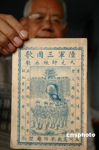 2008年11月4日,一本塵封80年民國年間出版的張作霖《大元帥練兵歌》在山東濱州無棣面世。該書1928年由天津河東特制、聚文山房發行。《大元帥練兵歌》唱的是民國共和,夸的是本軍統帥,說的是當兵意義,真實記錄了奉軍出操、練兵、行軍、打仗的場景。令人驚奇的是,被毛澤東反復推薦的紅軍歌曲《三大紀律八項注意》的曲調,竟是張作霖的《大元帥練兵歌》。中新社發 梁寶海 攝