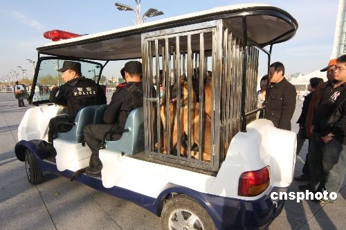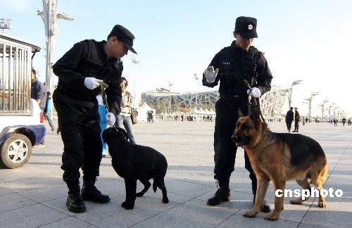 11月6日,一輛帶著警犬籠的警用電瓶車在“鳥巢”巡邏。近日,一支由“警犬電瓶車”、警用電動自行車組成的“車輪上的巡警隊”出現在北京奧運中心區里。而民警在巡邏中一般不攜帶警用匕首和手槍,這在全國巡警隊伍中也是少見的。如有游客因急事求助,民警駕駛的巡邏車可招手即停。 中新社發 吳芒子 攝