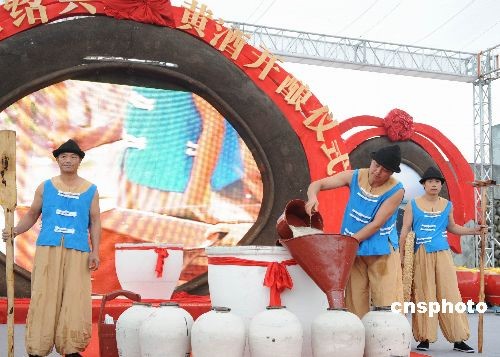 11月7日,2008中國紹興黃酒節在浙江紹興舉行。紹興是黃酒之鄉,也是全球黃酒生產量最大的城市。目前全市有黃酒企業86家,年產量達到41.3萬噸、年銷售額33.2億元,分別占全國的17.2%和35.6%。紹興黃酒行業擁有7個中國馳名商標、4只中國名牌產品和6家中華老字號。今天展示的15家“紹興黃酒”冠名企業,是其中的佼佼者,他們的總產量和銷售收入占據全市的90%。黃酒節期間,紹興將舉辦黃酒展覽會、黃酒開釀儀式,酒類趣味活動,黃酒品牌推廣文藝活動,黃酒品嘗活動以及院士紹興行和一系列經貿文化活動等。中新社發 袁云 攝