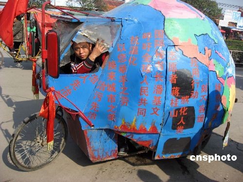 11月10日,一個地球模樣的三輪車來到安徽省亳州市宣傳環保,吸引市民駐足觀看。38歲的江西小伙蔣桂山自去年6月5日從江西九江開始,騎著自制的直徑一米的地球儀三輪房車宣傳環保,先后途經上海、天津等140個城市。之后,他來到安徽亳州講“環保”。蔣桂山預計用4年時間蹬著“地球車”走遍全國400多個城市,向人們宣傳節約用水、用電和能源,他想用這種特殊的方式引起人們關注環保。中新社發 張延林 攝