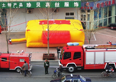 事發兩廣路與祈年大街路口西南角的珍貝大廈樓頂。記者9點多趕到時,消防員已在樓下充起氣墊,四周都拉起警戒線,有民警及交警疏散圍觀群眾。該樓高6層,樓頂立有4個一米高的漢字招牌,兩名中年女子就扶著鐵架,面對面騎坐在“大”、“廈”兩個招牌的旁邊,此時,兩人已在此坐了近兩個小時。據知情人透露,這兩名女子一名叫郭麗娜,吉林人,一名叫于秀敏,山東人,因錢在北京被搶而想不開,二人于近日認識。一名大廈的工作人員稱,頂層的大門一直是鎖著的,不知道這兩名女子如何爬到那個地方。由于二人脖子上均拴著繩子,如果墜下很可能發生危險,且她們所處的位置有障礙物阻擋,給民警的救援工作帶來困難。