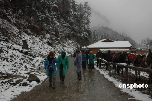 初冬時節,“最后的香格里拉”——四川稻城亞丁大雪紛飛。圖為在鵝毛般大雪中的藏族趕馬人。中新社發 肖龍聯 攝