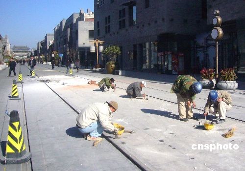 2008年11月13日, 北京前門大街南段,長50米、寬10余米的路段用警戒線圍了起來,施工人員正在對路面及其它設施進行維修整理。據悉,由于運貨車經常經過這里,致使部分青白石路面出現了裂縫和損毀。此次整修除了寬21米的大街外,中間的寬近3米長834米的青白石“御道”也是整修的重點,預計,整個工期將在一個月內完成。此次整修是對道路及地下線路的正常養,而這次對御道的整修也屬首次。中新社發 玉龍 攝