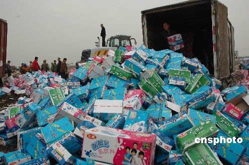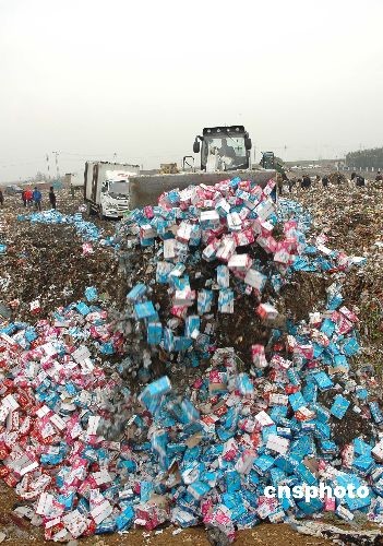 11月17日,河南南陽市臥龍區(qū)在生活垃圾處理場集中銷毀“三鹿”問題液態(tài)奶。當(dāng)日,該區(qū)共銷毀從經(jīng)銷商回收和工商機(jī)關(guān)監(jiān)督統(tǒng)一下架、集中扣押、封存和消費者退回的問題“三鹿”純牛奶、酸奶、早餐奶等液態(tài)奶16噸,在生活垃圾場采取碾壓、深埋,進(jìn)行無害化處理。中新社發(fā) 熊運彬 攝