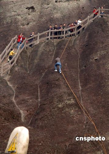 2008年11月17日,福建自然風景名勝武夷山每天都吸引許多游客前來游玩,然而許多游人隨手丟棄的旅游垃圾醒目地散落在秀麗的山間上,為了保護景區環境,工作人員只好在高達800米陡峭的山間中拾垃圾,被游人喻為武夷山上的“蜘蛛人”。中新社發 張斌 攝