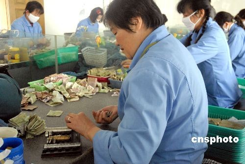 昆明公交公司共有196條無人售票公交線路,3200臺公交車,今年以來,平均每月都會收到近10萬元的假硬幣,僅此一項公交公司每年就要虧100多萬。圖為昆明公交公司收銀中心點鈔員正在點鈔。中新社發 蔣晨 攝