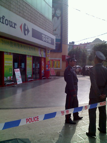 29日上午,云南省昆明市龍泉路家樂福超市發(fā)生人質(zhì)劫持事件,3名市民被歹徒刺傷,1人被劫持。經(jīng)多方談判未果,為保護人質(zhì),警方開槍擊斃歹徒。