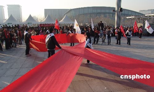 12月1日,在北京舉行的紀(jì)念世界艾滋病日大型宣傳活動上,一些青年打開一幅巨型紅絲帶征集簽名,以表達(dá)對艾滋病感染者、病人及其家庭的關(guān)愛。當(dāng)天是世界艾滋病日,中國紅十字會總會、聯(lián)合國艾滋病規(guī)劃署和紅十字會與紅新月會國際聯(lián)合會,共同在北京舉辦“同一個夢想——沒有歧視的世界”紀(jì)念世界艾滋病日大型宣傳活動。中新社發(fā) 范欣 攝
