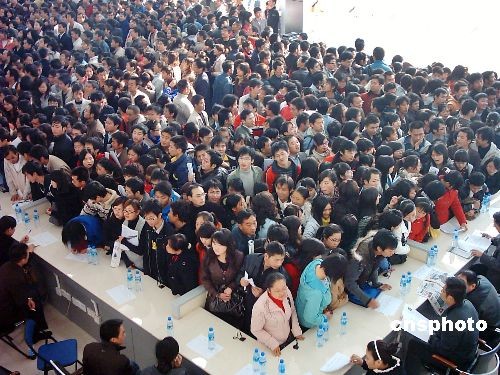 貴陽市某人力資源市場舉行的首場招聘會上,前來求職的返鄉農民工和大學生擠滿了整個人才市場。經過精心籌備,使當天進場招聘的單位達80余家,提供保安、保潔、廚師、服務員、焊工、建筑等崗位800多個。由于近段時間從外省返鄉的農民工不斷增多,即將畢業的大學生和社會失業人員的求職需求也比較大,使得當天的招聘會異常火爆,進場招聘和求職的人員達到數千人,將人才市場擠得水泄不通。中新社發 彭年 攝