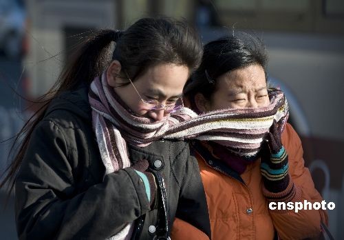 2008年12月4日,入冬以來最強冷空氣入侵北京,街頭兩位女士共用圍巾手套在寒風中艱難前行。當日,入冬以來最強冷空氣入侵我國大部。中央氣象臺連續兩天發布了今年首次寒潮橙色警報,中國氣象局啟動氣象災害應急預案Ⅲ級應急響應命令。中新社發 王辰 攝