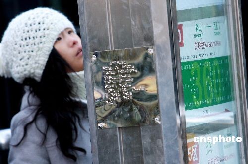 12月5日,在北京白石橋附近的一個公交站點,盲文公交站牌的亮相吸引不少市民的目光。為了方便盲人朋友換乘公交車,北京公交車站的工作人員在普通站牌上特設了具有盲點的盲人公交站牌,使北京交通無障礙設施進一步得到完善,充分體現了首都人民對殘障人士出行的關愛和幫助。中新社發 鄭雄增 攝