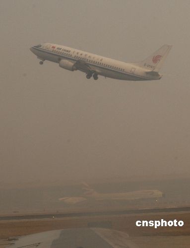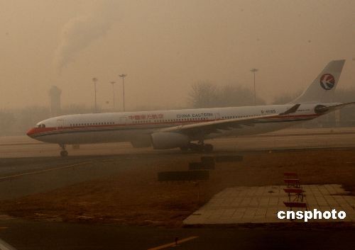 12月11日上午,北京首都國際機場周邊地區少量降雪,形成霧霾天氣,造成部分進出港航班延誤。中新社發 趙振清 攝