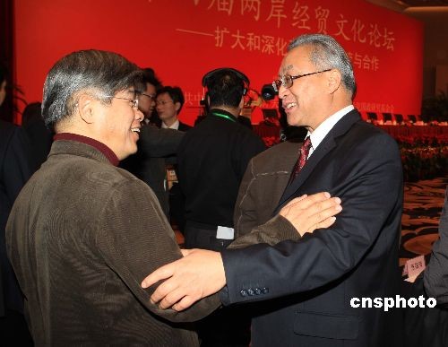 12月20日,第四屆兩岸經貿文化論壇在上海開幕,臺灣記者熱情問候與會的張銘清(右)先生。中新社發 潘索菲 攝
