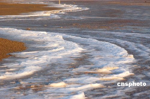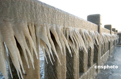 12月22日,連云港受強冷空氣影響,最低氣溫零下8攝氏度。在西北大風作用下海上生成了滔天巨浪,濺在海岸邊護欄上的海水凍結成了晶瑩剔透的冰凌,沙灘上也是白茫茫的一片雪地,給寒冬里的連云港海濱增添了一道生態風景線,不少游人觀賞到難得一見的景觀。中新社發 王春 攝