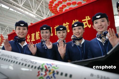十二月二十六日下午三點,青島-臺北直航班機從青島流亭國際機場起飛,駛向臺北桃園國際機場,拉開青島臺北兩市直航的序幕。此后,每周二、周五各有一班常態包機航班從青島直飛臺北。青島臺灣直航后,旅程由原來七個小時縮短到兩個半小時,費用節約百分之三十,實現兩岸一日生活圈的夢想。圖為在首航直飛包機航班上服務的部分乘務人員在慶祝直航儀式上。中新社發 王群 攝