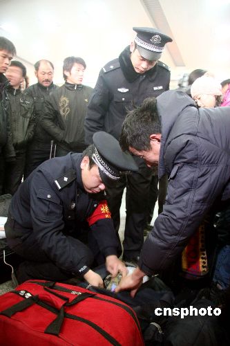 2009年1月5日,在沈陽北站售票大廳兩名鐵警正在對“重點旅客”進行檢查。據沈陽鐵路警方透露今年春運從1月11日開始至2月19日結束,節前15天,節后25天,共計40天。由于今年新年、春節間距時間較短,使農民工、學生和探親流交織在一起,呈現出啟動早、持續時間長的特點,為創造和諧的春運治安環境,沈陽鐵路警方開展了以春運安全為重點內容的“鐵鷹”、“藍盾”、“利劍”和“天網”專項行動。以打擊盜搶旅客財物、制販假票及拆盜、割盜等各類危害運輸車輛的違法犯罪活動,全力維護群眾的合法權益。中新社發 趙敬東 攝