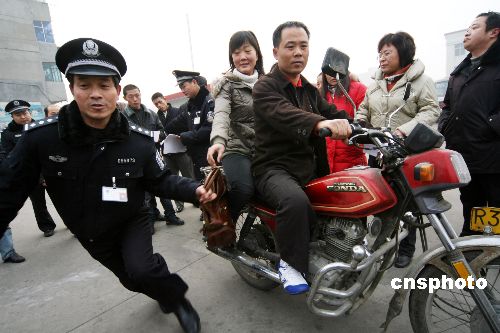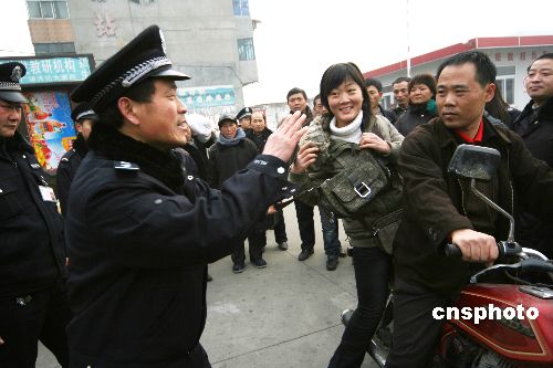 1月7日,河南許昌民警和熱心市民一起模擬防搶演練。春運即將來臨,為讓旅客出行安全,河南許昌警方和熱心市民在該市客運南站開展“防搶奪反詐騙演練”活動,民警和熱心市民一起對“飛車搶奪”、“丟包”、“設陷阱”等常見的搶奪及詐騙手段進行演練,為過往旅客防搶防扒防騙支招。中新社發 牛書培 攝