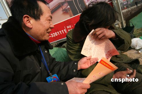 1月22日,許昌市救助管理站的工作人員在救助一個生活無著人員。春節即將到來,為更好地向困難群體獻愛心、送溫暖,不讓一個生活無著人員流落街頭,當日,河南省許昌市救助管理站開展“迎新春社會關愛生活無著人員”活動,對符合救助條件的求助者,無償提供食宿、幫助聯系親屬等。這次活動除與各區縣救助站同時開展宣傳、咨詢活動外,還會派流動小分隊走上街頭,對生活無著人員進行勸導,實施現場救助。中新社發 牛書培 攝