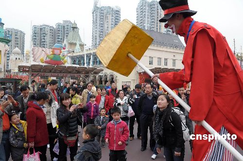 一月二十六日,中國農歷大年初一,深圳歡樂谷、世界之窗、紅樹林海濱公園、東部華僑城等旅游景區游人如織。圖為深圳歡樂谷滑稽演員與游客同樂。中新社發 陳文 攝