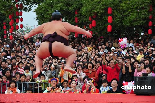 2009年2月1日,日本相撲手為廣大游客表演。第二屆廣州(番禺)櫻花文化節(jié)自1月26日在大夫山森林公園開(kāi)幕以來(lái),每天吸引數(shù)萬(wàn)游人。活動(dòng)除了有姹紫嫣紅的櫻花觀賞外,還有豐富多彩的表演。本屆櫻花文化節(jié)將于3月15日閉幕,歷時(shí)49天。中新社發(fā) 盤(pán)石 攝