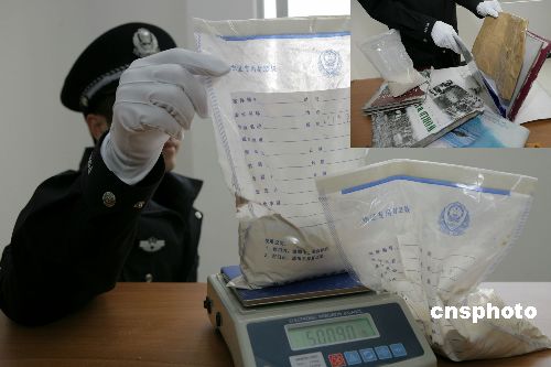 二月三日,福州海關緝私警察展示新繳獲的毒品海洛因。連日來,福州海關駐長樂機場辦事處旅檢關員在對吉隆坡-廣州-福州航班進行監管時,連續查獲三起東南亞籍旅客涉嫌走私毒品入境案件,共繳獲毒品海洛因凈重四千六百七十七點六克,抓獲犯罪嫌疑人三名。中新社發 陳多 攝