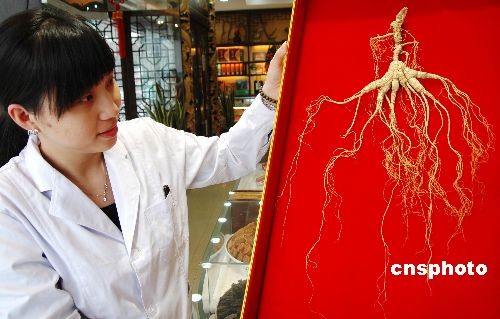 2009年2月5日,一株重約80克、售價高達100萬元的“天價”野山參王亮相蘇州南春堂藥鋪。據了解,如此巨型人參在野山參生長史上實為罕見,具有極高的收藏和藥用價值。中新社發 朱子寒 攝