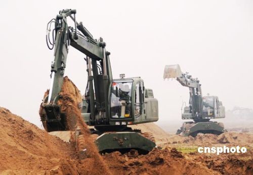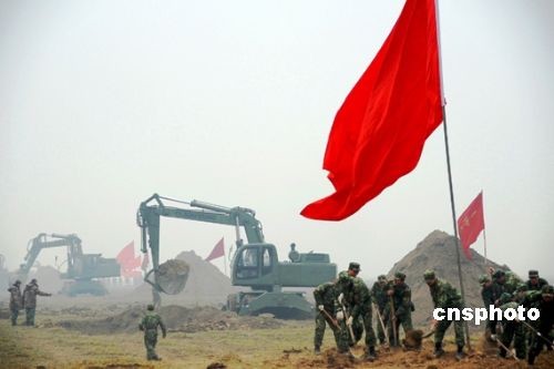 2月8日,剛剛赴蘇丹維和歸來的駐沁某部官兵正在河南省新鄉市封丘縣柳園口黃河灘區開挖引黃灌溉渠。據了解,駐沁某部接濟南軍區命令,于2月7日緊急馳援新鄉市封丘縣柳園口執行抗旱救災。據悉,該部將用5天時間在柳園口黃河灘開挖一條長2700米、寬18米、深3.5米,總工程量11.6萬立方米的引黃灌溉渠,渠道開通后將解決400萬畝麥田的灌溉問題。 中新社發 杜文旭 攝