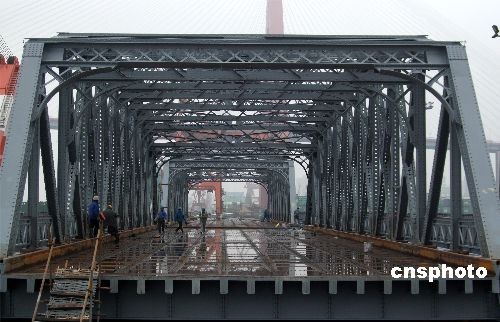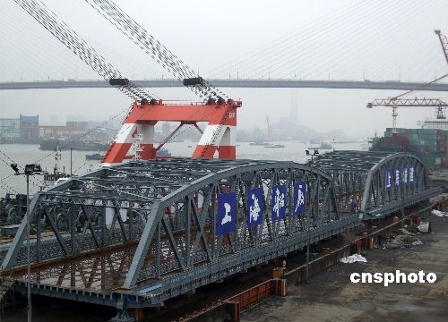 2月24日,上海百年外白渡橋在民生路碼頭接受最后“治療”。該橋2008年4月為配合上海外灘地區交通綜合改造工程而移橋修繕,經過近一年的修繕,將于25、26日兩天分北、南兩跨橋身分別移回蘇州河,重新“上崗”后有望繼續提供服務50年以上。中新社發 鄭瑩瑩 攝
