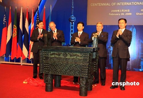 2009年2月26日,“萬國禁煙會”百年紀念活動在上海舉行,來自泰國、英國、美國、越南等16個國家的政府代表團以及聯合國毒品和犯罪問題辦公室、國際麻醉品管制局代表出席。中國國務委員、公安部部長孟建柱(中)與參會代表一起為“萬國禁煙會”百年紀念鼎揭幕。中新社發 湯彥俊 攝
