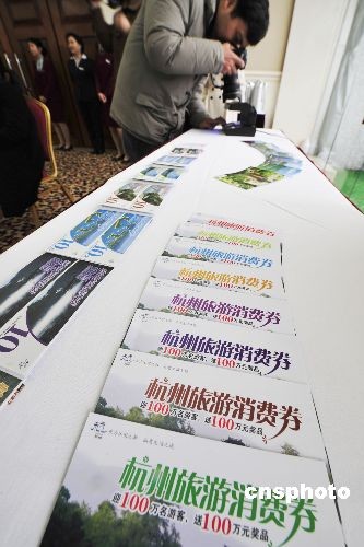 2月26日,杭州市宣布“杭州旅游消費券”發放及使用說明,并開始正式面向以長三角地區為重點的國內及港澳臺旅游市場免費發放240萬份總面值為1.5億元的“杭州旅游消費券”,從2009年3月1日起至5月31日止,持券游客來杭旅游可在指定商家使用并享受相應的優惠。 中新社發 李忠 攝