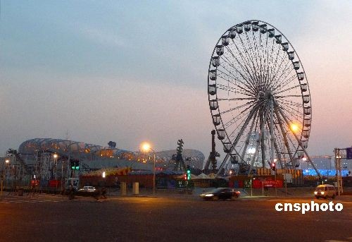 2009年3月7日傍晚,北京奧林匹克公園,巨大的摩天輪與鳥巢交相輝映。據悉,鳥巢旁的首個嘉年華目前正在加緊調試中,預計將于3月中旬開業迎客。 中新社發 玉龍 攝