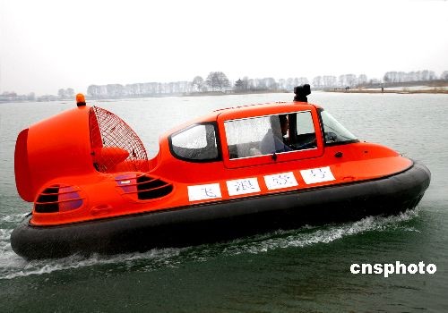 3月10日,國內首批國產氣墊船在東海縣成功下線后,4艘氣墊船已到達黃河內蒙古段的凌訊排除第一線的冰凌區,執行“破凌”任務。 中新社發 魏愛華 攝