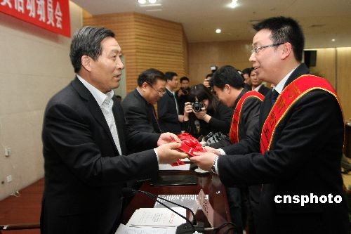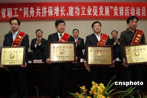 2009年3月19日,“河南省五一勞動獎”表彰大會在鄭州舉行,52個集體獲得“河南省五一勞動獎狀”,121名先進個人獲得“河南省五一勞動獎?wù)隆薄:幽鲜「笔¢L史濟春為獲表彰人員頒獎。中新社發(fā) 陳代述 攝