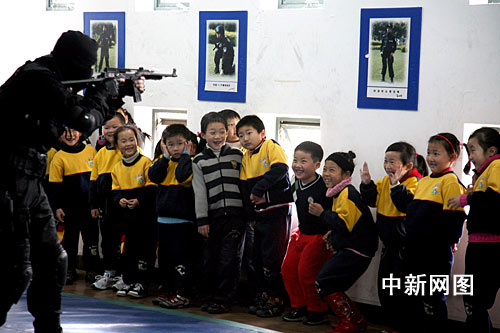 中新社上海3月21日電 3月20日,上海市金山區警方舉行了主題為“大手牽小手、平安迎世博”警營開放日活動。來自川、貴、甘、贛、皖等省的外來務工人員子弟作客警營,真實感受公安干警工作、學習和生活,體會全社會給予他們的深切關愛。