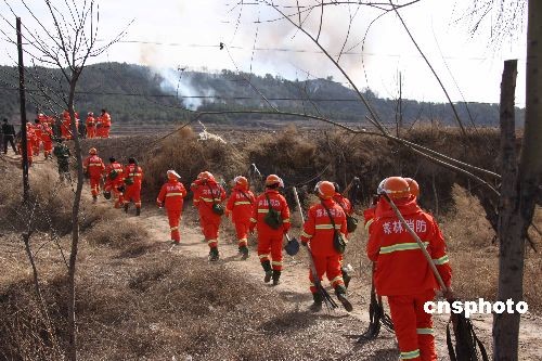 2009年3月28日下午2時左右,山西省盂縣東梁鄉(xiāng)東梁村騎龍山發(fā)生森林火災(zāi)。 森林火災(zāi)發(fā)生后,當(dāng)?shù)卣⒐病⒘謽I(yè)、醫(yī)務(wù)等部門第一時間趕到現(xiàn)場,組織滅火,并啟動了相關(guān)應(yīng)急預(yù)案。當(dāng)?shù)爻鰟訑?shù)百名干部群眾撲火,陽泉市武警也趕赴現(xiàn)場增援。由于火勢兇猛,在附近的村莊都能聽到火燒山林的聲音,山火的灰塵甚至飄到了最近的溫家山村。截至發(fā)稿時,沒有人員傷亡報告。中新社發(fā) 程瑜 攝