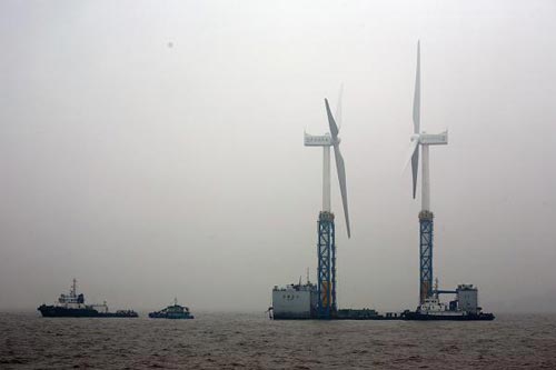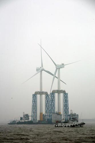 人民網(wǎng)上海4月5日電 昨晚,國家海上風電示范項目、上海市重大工程——東海大橋100兆瓦海上風電場的第二、第三臺風機,在上海洋山港海事處的護航和監(jiān)控下,經(jīng)過38海里的海上航行,被一次性運抵吊裝作業(yè)地點。