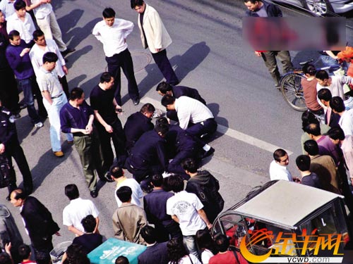 來到路邊,該男子連著打了兩輛出租車都被拒絕,正當他準備打第三輛的時候,突然一只“飛腳”從背后將他踹倒在地。據目擊者劉先生稱,隨著該男子倒地,周圍一群人和民警迅速將他摁住,立即扭住了他拿槍的那只手,隨后給他戴上了手銬,押上了警車。