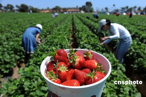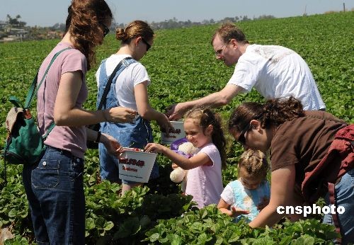 當(dāng)?shù)貢r(shí)間五月二十三日,許多居民來(lái)到加州卡爾斯班的草莓田采摘鮮嫩誘人的草莓。當(dāng)天是美國(guó)陣亡將士紀(jì)念日假期的第一天,通常也是美國(guó)民眾出游的日子。據(jù)美國(guó)汽車協(xié)會(huì)預(yù)測(cè),盡管遭遇經(jīng)濟(jì)衰退和甲型H1N1流感疫情,但這個(gè)周末仍有三千兩百多萬(wàn)美國(guó)人出游,比去年同期增長(zhǎng)百分之一點(diǎn)五。中新社發(fā) 張煒 攝