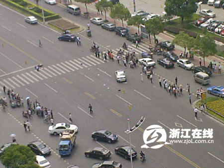 5月15日上午9時35分許,蕭山區金城路浙商銀行門口發生一起車禍,一輛白色寶馬車撞上了一輛橫穿馬路的電動車,電動車上的一家三口摔倒在地,小女孩頭部受創,電動車被撞出去近20米遠。隨后,三名傷者被送往蕭山醫院和蕭山中醫院進行搶救,小女孩和媽媽傷勢比較嚴重。