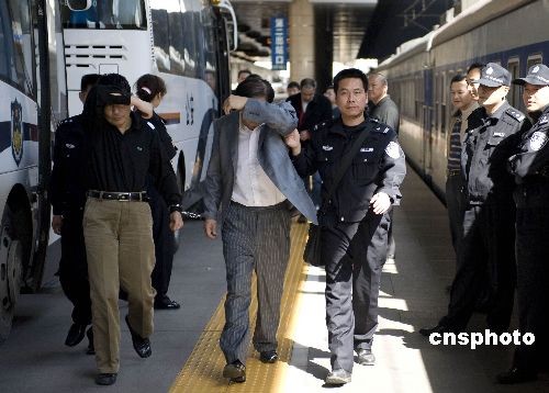 廣西南寧一名人稱傳銷業(yè)“教授”的何姓老漢,因組織在南寧市從事傳銷的140多名外省籍傳銷人員到北京參加所謂的“第二屆群英會暨振興民族經(jīng)濟(jì)杰出華人高峰論壇”,被南寧警方抓獲。日前,“何教授”等4名主要犯罪嫌疑人已被南寧市青秀區(qū)人民檢察院以組織、領(lǐng)導(dǎo)非法傳銷罪批準(zhǔn)逮捕。圖為南寧市經(jīng)濟(jì)犯罪偵查支隊(duì)民警將“何教授”等人從京押解回南寧。中新社發(fā) 韋強(qiáng) 攝