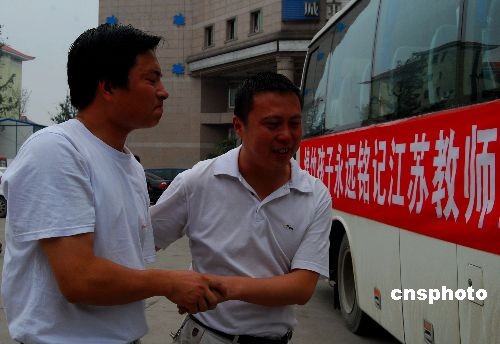 6月16日中午,綿竹地震災(zāi)區(qū)最后一批52名江蘇幫扶支教老師圓滿完成為期131天的支教任務(wù),離開綿竹踏上歸途。綿竹社會(huì)各界群眾和學(xué)生組成的軍樂隊(duì)前來為他們送行。據(jù)悉,地震后,江蘇省先后派遣了110名中小學(xué)骨干教師前往綿竹災(zāi)區(qū)各中小學(xué)擔(dān)負(fù)支教任務(wù)。中新社發(fā) 胥輝 攝
